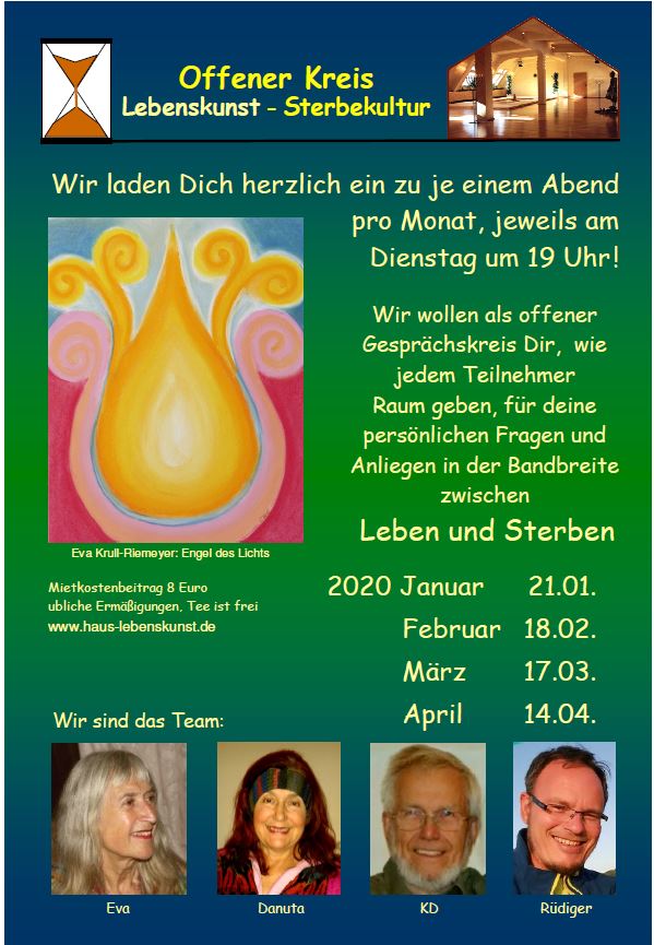 Der Offene Arbeitskreis Lebenskunst - Sterbekultur lädt einmal im Monat dienstags im Haus Lebenskunst ein zu einem Gedankenaustausch.