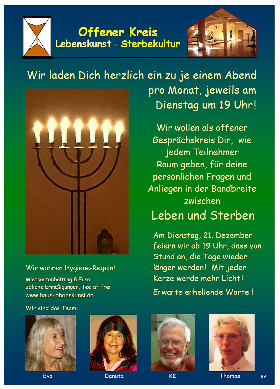 Der Offene Arbeitskreis Lebenskunst - Sterbekultur lädt einmal im Monat dienstags im Haus Lebenskunst ein zu einem Gedankenaustausch.