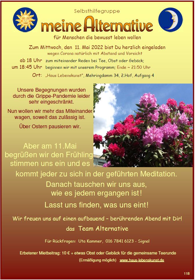 Das Team von "meine Alternative" lädt einmal im Monat mittwochs im Haus Lebenskunst zu einem gestalteten Abend ein, immer mit Gedankenaustausch.