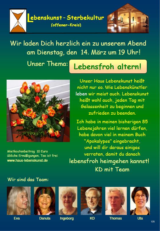 Der Offene Arbeitskreis Lebenskunst - Sterbekultur lädt einmal im Monat dienstags im Haus Lebenskunst ein zu einem Gedankenaustausch.