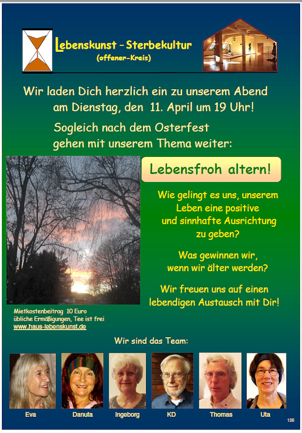 Der Offene Arbeitskreis Lebenskunst - Sterbekultur lädt einmal im Monat dienstags im Haus Lebenskunst ein zu einem Gedankenaustausch.